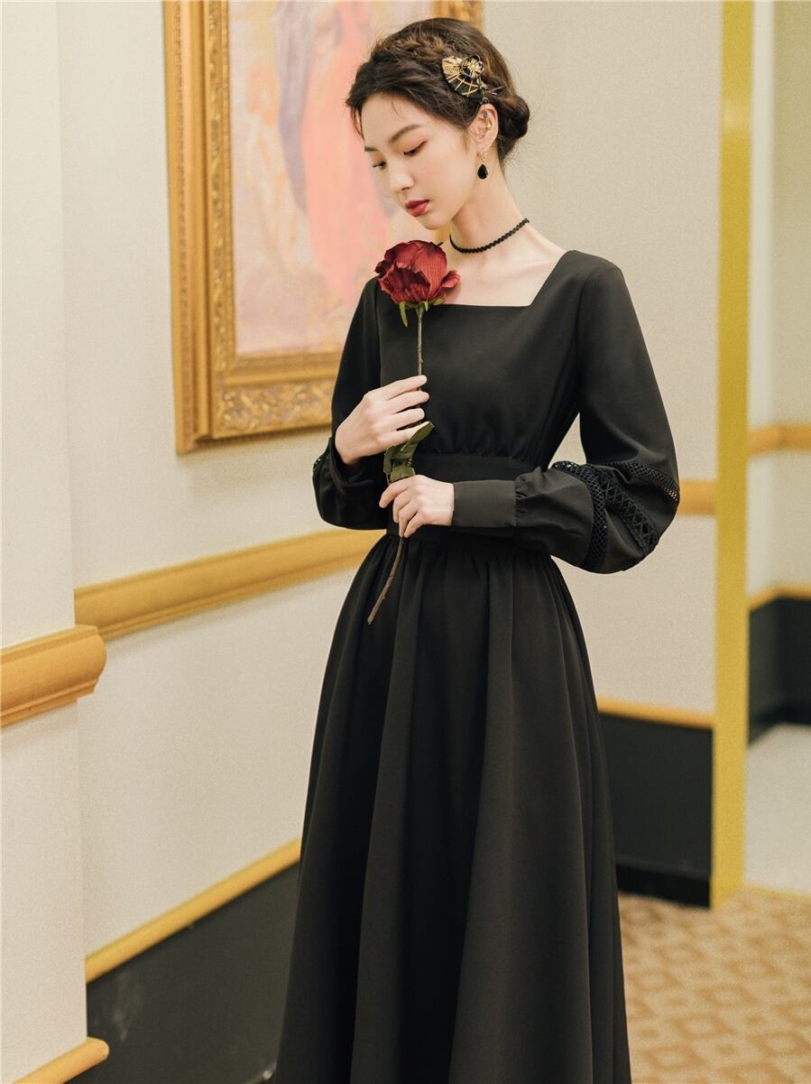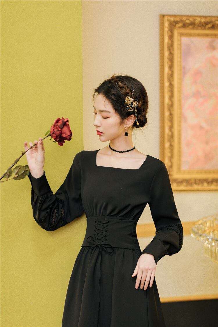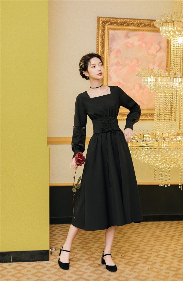 ♥シックなスタイルが美しい♫ ミモレ丈ブラックワンピース スカート ロング ウェストドレス 秋物 冬物 韓国系 ガーリー お呼ばれ カジュアル フェミニン AA3665742 | miel style clothing