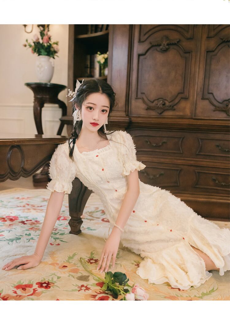 セレブな雰囲気♥ミモレ丈ふんわりワンピース スカート スタンダードドレス レトロ 夏物 フラワーデザイン 韓国系 ガーリー お呼ばれ カジュアル フェミニン AA4341096 | miel style clothing