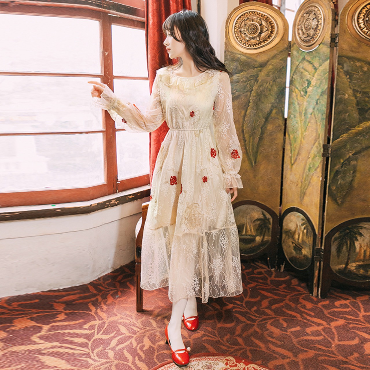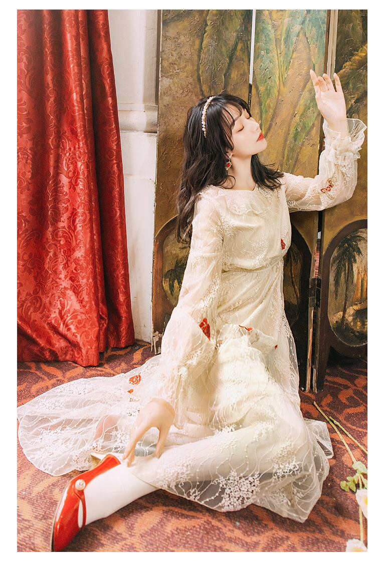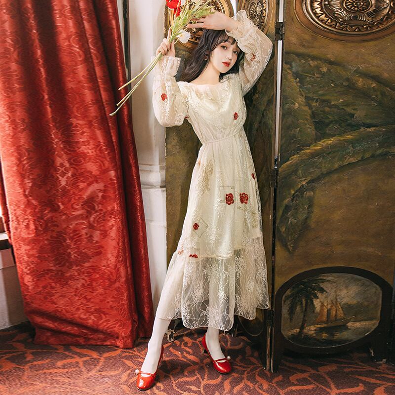 透け感ふんわり♫ お姫様系レースふんわりマキシ丈ワンピース スカート スタンダードレースロングアンクルドレス スプリング レトロ 春物 韓国系 ガーリー お呼ばれ カジュアル フェミニン AA8924949 | miel style clothing