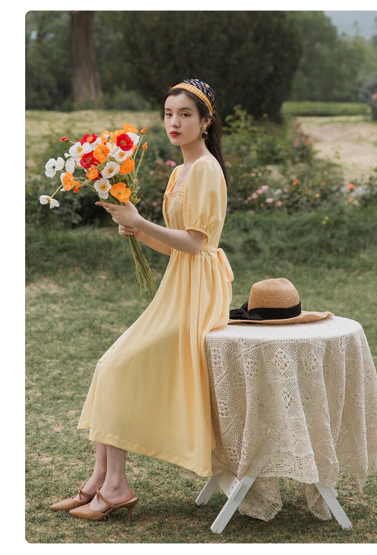 お嬢様系 マキシイエローワンピース サマースタンダード ロングカラードレス レトロ 夏物 スカート フラワーデザイン スクウェア 韓国系 ガーリー お呼ばれ カジュアル フェミニン AA8545984 | miel style clothing