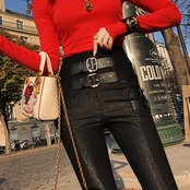 ♥ベルトデザインが個性的なハイウェストストレッチブラックパンツ スリム エラスティック 韓国系 ガーリー お呼ばれ カジュアル フェミニン BB5946453 | miel style clothing