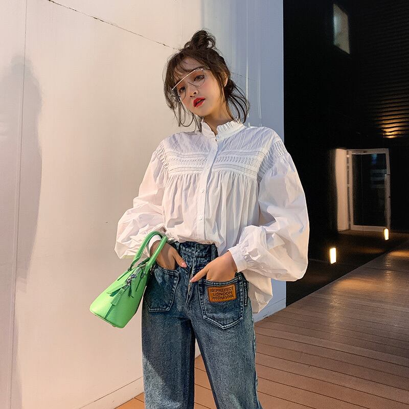 袖フレア☆華奢見せホワイトシャツブラウス スタイルシャツ スリーブスタンドカラーカラートップス レディース レース 韓国系 ガーリー お呼ばれ カジュアル フェミニン BB7243436 | miel style clothing