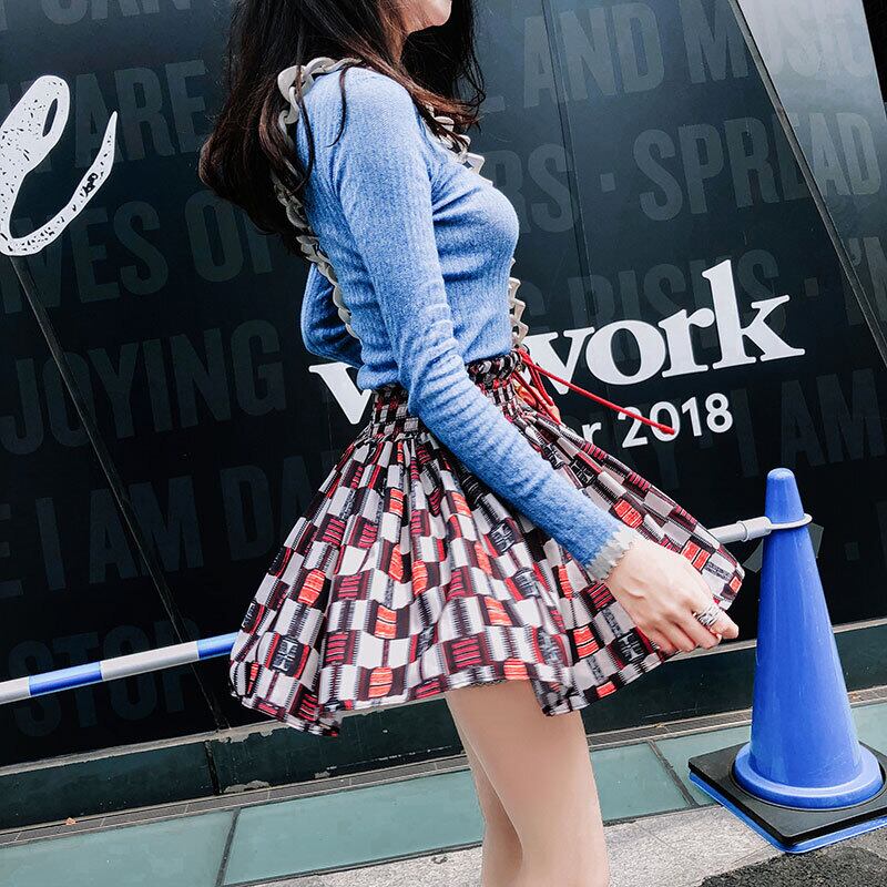 チェック柄が美しい♫レースプリーツスカート ストレッチウェスト レッド スプリングハイウェストショートAライン エラスティック 伸縮 春物 韓国系 ガーリー お呼ばれ カジュアル フェミニン BB6624655 | miel style clothing