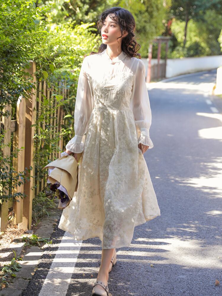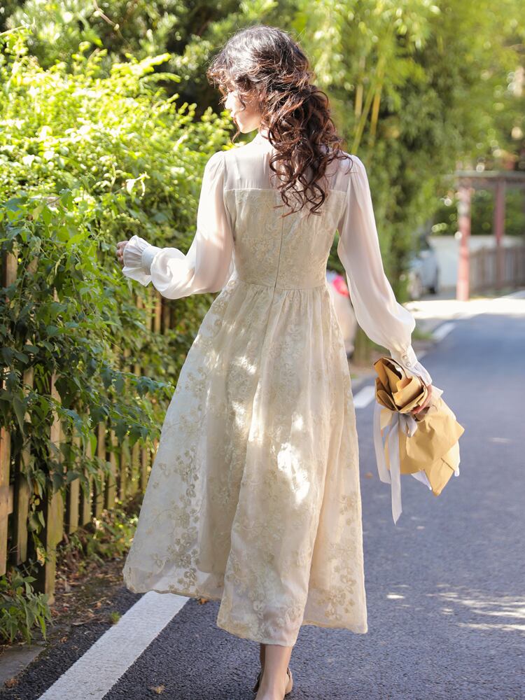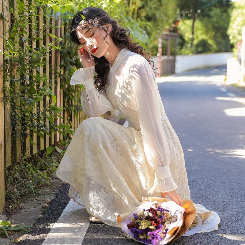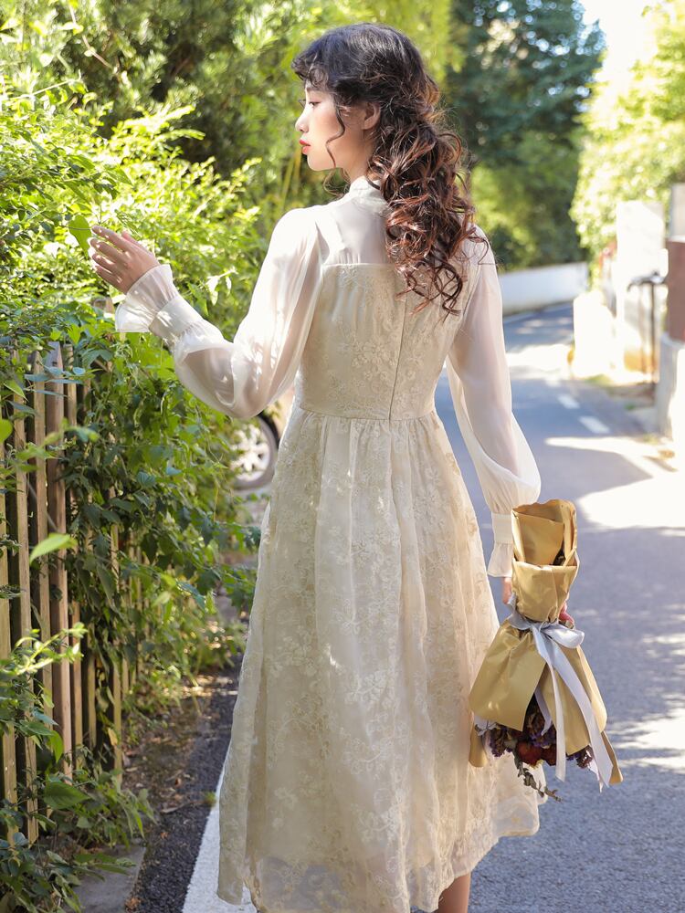 袖フレア☆華奢見せ♥レトロなワンピース オータムウィンタースカート スタンダードハイウェスト ドレス ワンピース レトロ 秋物 冬物 フラワーデザイン 韓国系 ガーリー お呼ばれ カジュアル フェミニン AA5088940 | miel style clothing