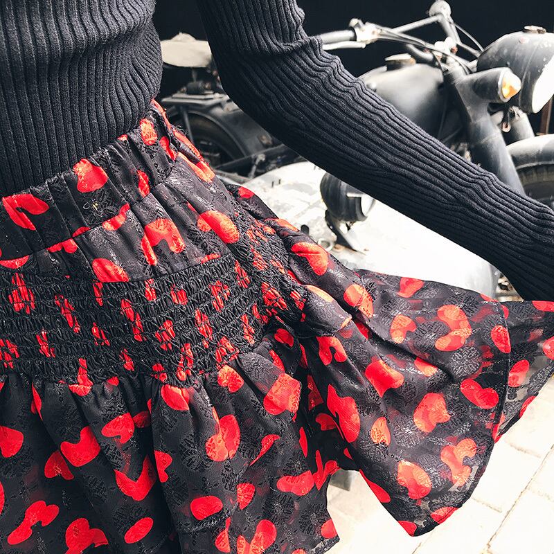 個性が光る♥ブラックショート花びらスカート オータム レッドフローラル ウェストプリーツ ハイウェスト 秋物 花柄 韓国系 ガーリー お呼ばれ カジュアル フェミニン BB5822610 | miel style clothing