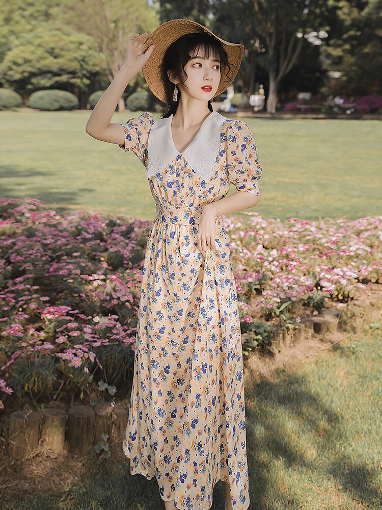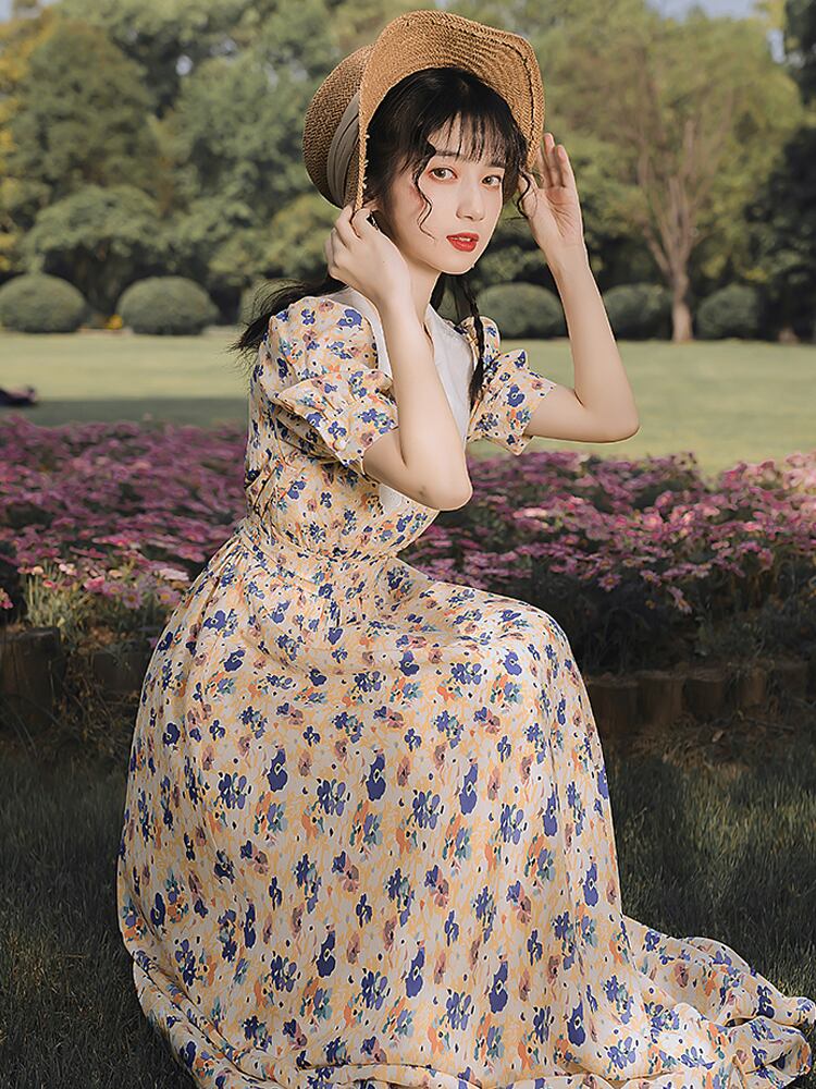 ♥襟がキュートなレトロシフォンフローラルワンピース ロングスカート マキシスタンダードドレス ワンピース レトロ 花柄 韓国系 ガーリー お呼ばれ カジュアル フェミニン AA8401189 | miel style clothing