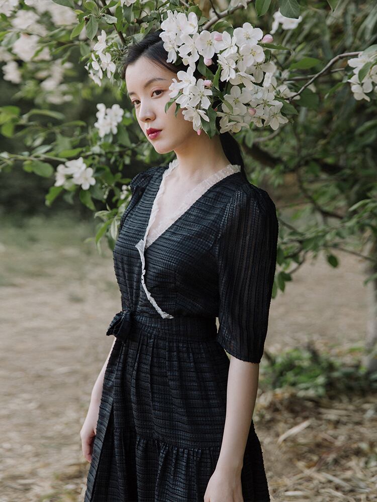 カシュクールスタイルVネックワンピース ブラックスカート ウェストドレス ワンピースワンピースサマー 夏物 フラワーデザイン 韓国系 ガーリー お呼ばれ カジュアル フェミニン AA0888774 | miel style clothing