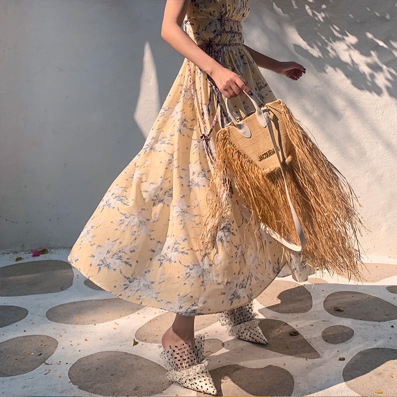 ノースリーブイエローマキシワンピース ウエストすっきり☆着痩せ膝丈 ひざ丈ロングスカート 韓国系 ガーリー お呼ばれ カジュアル フェミニン BB3722621 | miel style clothing