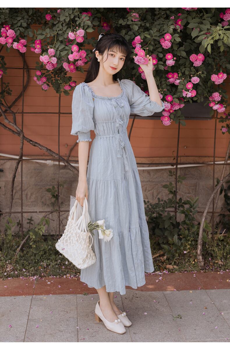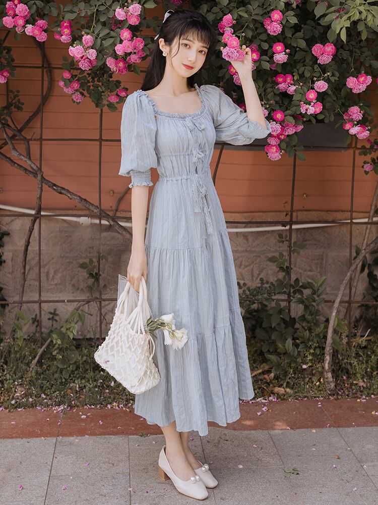 ティアードブルーGLワンピースシフォンドレスOP スカート ロングマキシきれいめ☆ レトロ レース フラワーデザイン スクウェア 韓国系 ガーリー お呼ばれ カジュアル フェミニン AA7997048 | miel style clothing