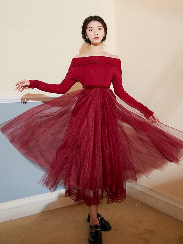 きれいめ☆メッシュレッドスカート 韓国系 ガーリー お呼ばれ カジュアル フェミニン AA4001838