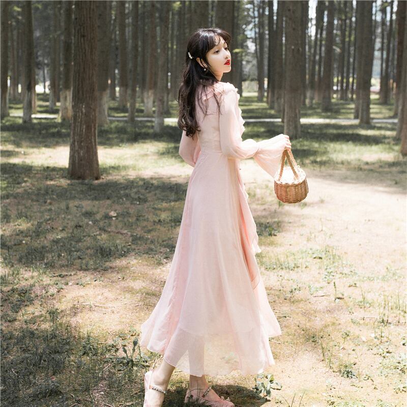 フランソワーズ的なマキシ丈ロマンティックピンクワンピース 韓国系 ガーリー お呼ばれ カジュアル フェミニン AA7955659