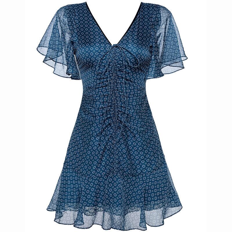 ブルーVネック花柄シフォンスタンダードウエストすっきり☆着痩せスカート レトロ 韓国系 ガーリー お呼ばれ カジュアル フェミニン BB9980480