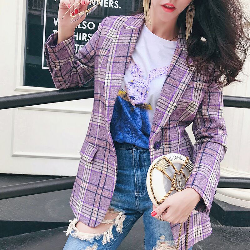 チェック柄ブレザー ♥カワイイ♥きれいめ☆ロング パープル 韓国系 ガーリー お呼ばれ カジュアル フェミニン BB0344537