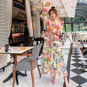 プリントウエストすっきり☆着痩せワンピース膝丈 ひざ丈 韓国系 ガーリー お呼ばれ カジュアル フェミニン BB2795783