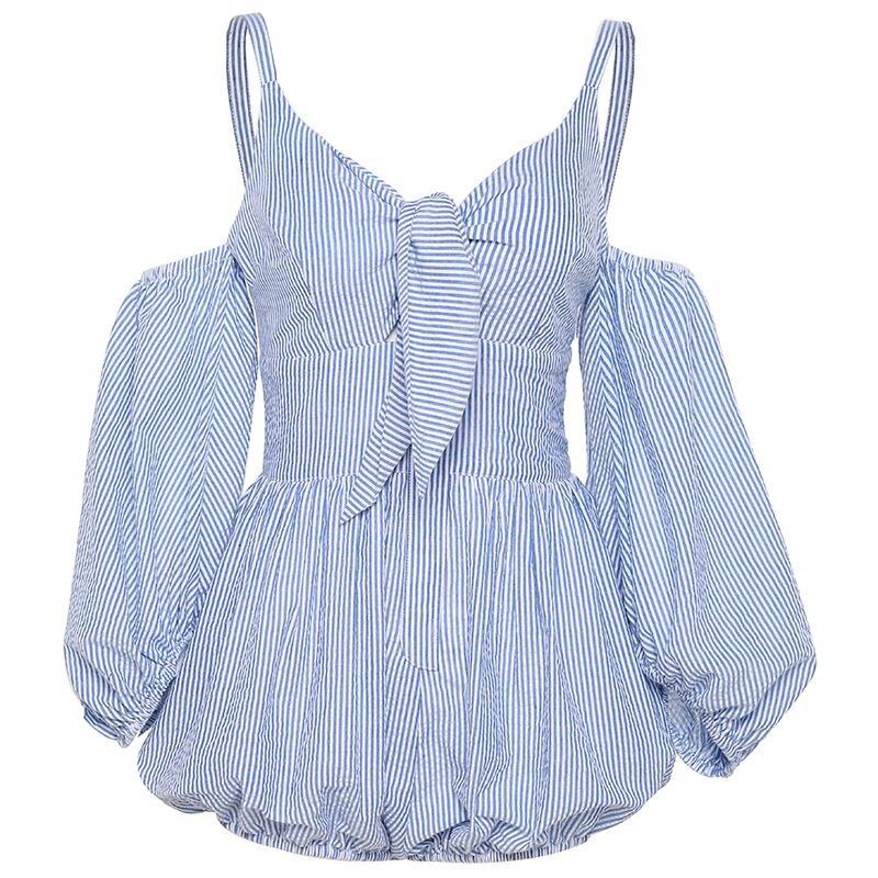ブルー白ストライプジャンプスーツ ジャンパースカート♥カワイイ♥オフショルダーショートトップス パンツ ホワイト ランタンスリーブ 韓国系 ガーリー お呼ばれ カジュアル フェミニン BB8509240 | miel style clothing