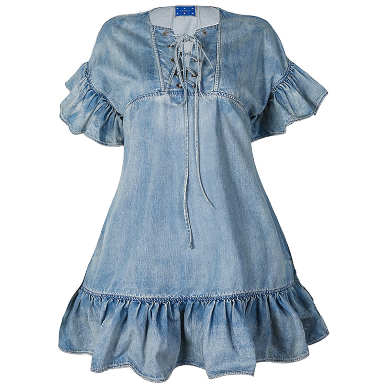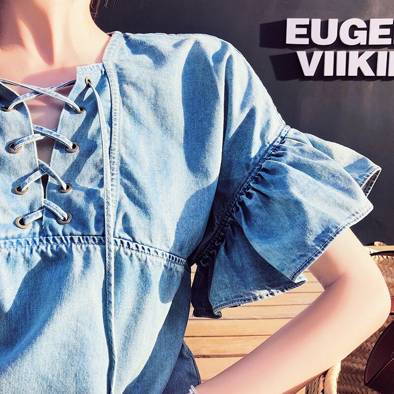 胸元編み上げストーンウォッシュブルーフリルパフスリーブワンピース ♥カワイイ♥スカート レトロ 韓国系 ガーリー お呼ばれ カジュアル フェミニン BB7026788 | miel style clothing