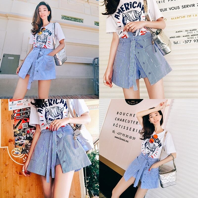 サマーブルー白ストライプワイドレッグスカート パンツ ショートパンツ ホワイト 夏物 韓国系 ガーリー お呼ばれ カジュアル フェミニン BB1478801 | miel style clothing
