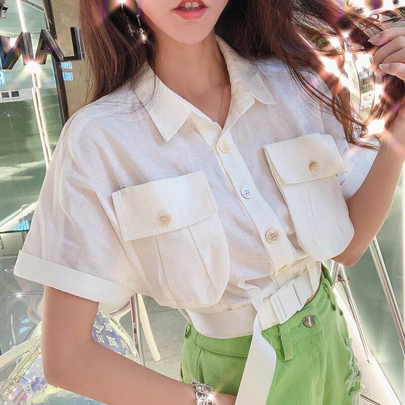 白ショートウエストすっきり☆着痩せシャツブラウス♥カワイイ♥ジャケット 大人女子☆ ホワイト コットン 半袖スリーブ 韓国系 ガーリー お呼ばれ カジュアル フェミニン BB9941246 | miel style clothing