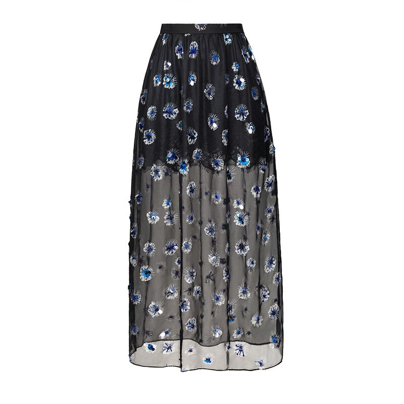 ブラックレースプリント柄スカート ロングウエストすっきり☆着痩せスリムメッシュ 韓国系 ガーリー お呼ばれ カジュアル フェミニン BB8618928