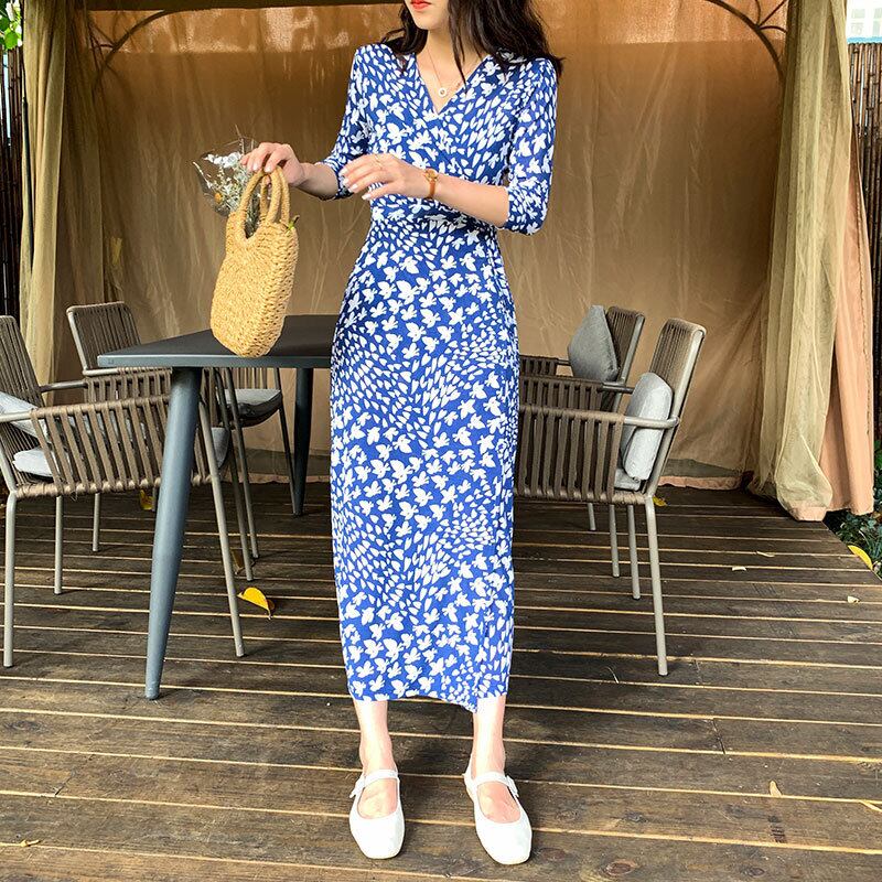 ♥♡♥ ブルー白プリントクロップドスリーブVネックレースきれいめ☆ ホワイト ヨーロピアン ♥♡♥韓国系 ガーリー お呼ばれ カジュアル フェミニン エレガ ント ビジュー 清楚 オルチャン CC1063580 | miel style clothing