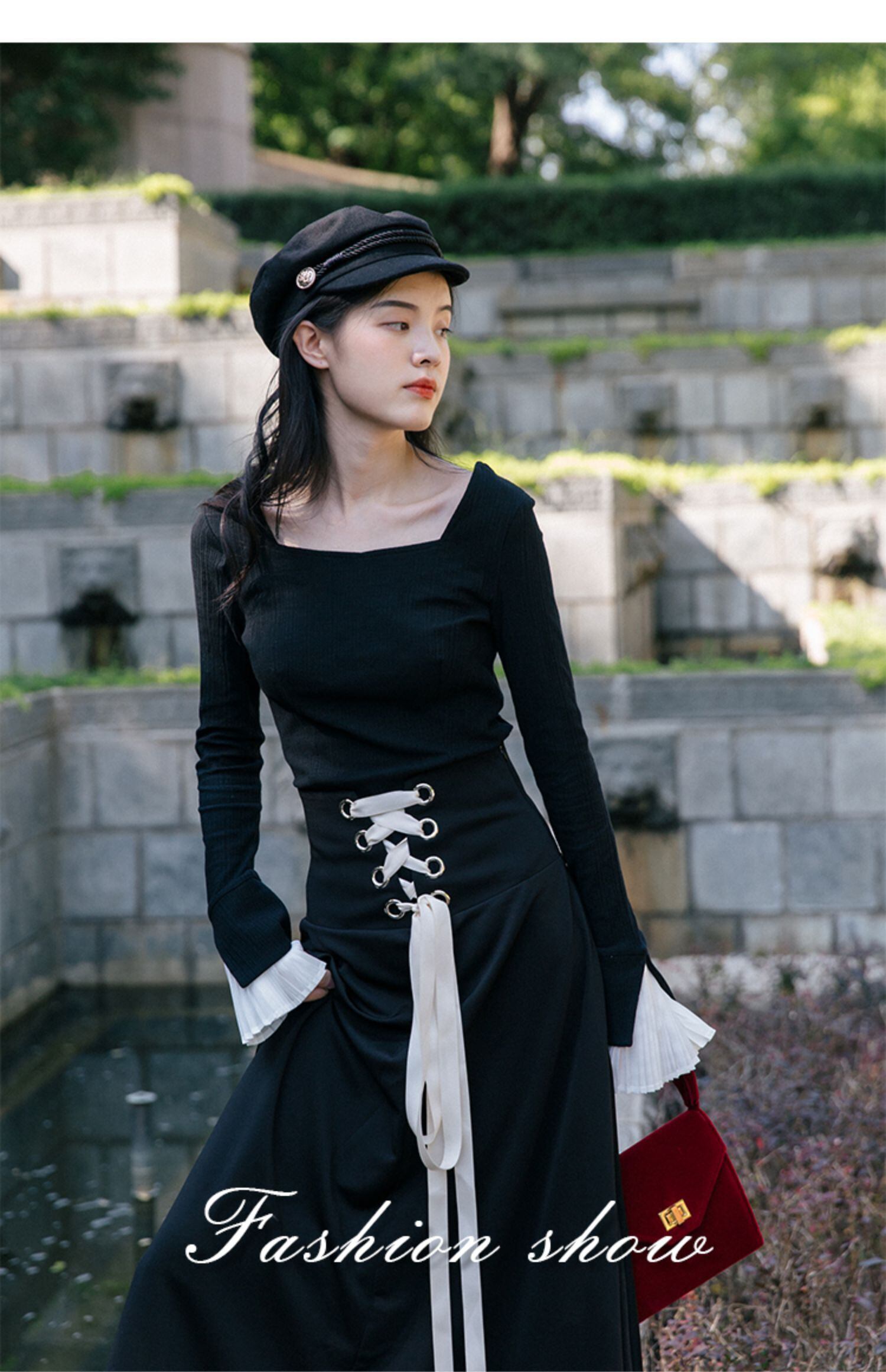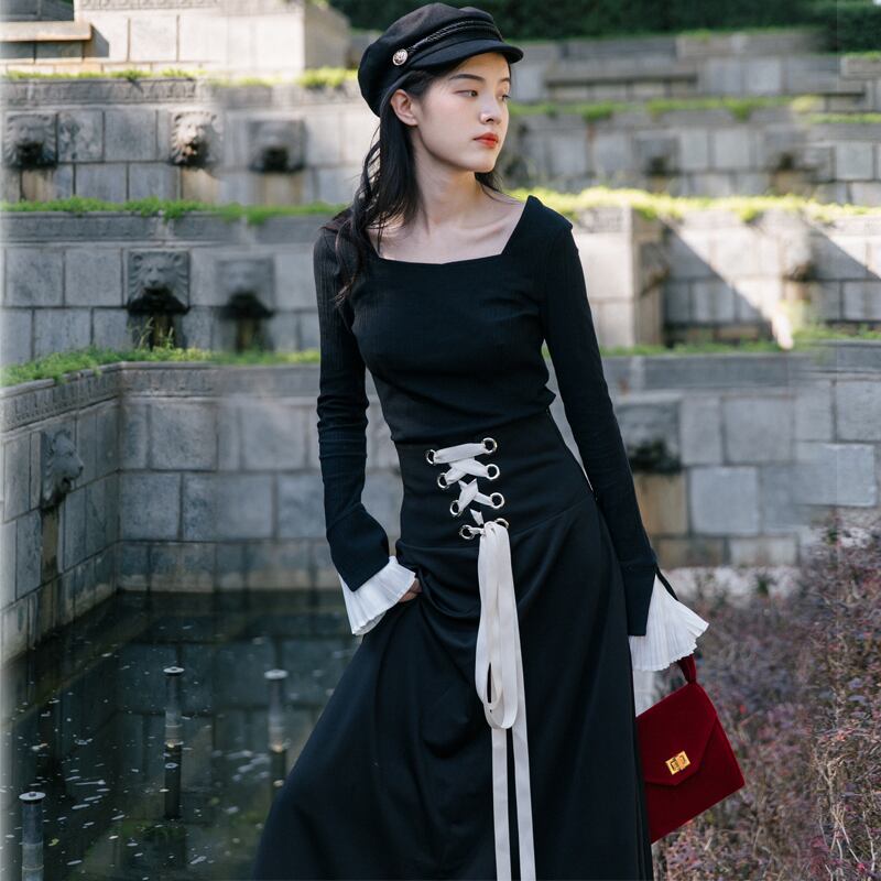 ♥♡♥ バイカラースクエアネックワンピースドレスOP スカート ウエスト セーター きれいめ☆ レトロ ♥♡♥韓国系 ガーリー お呼ばれ カジュアル フェミニン エレガント ビジュー 清楚 オルチャン AA5538802 | miel style clothing