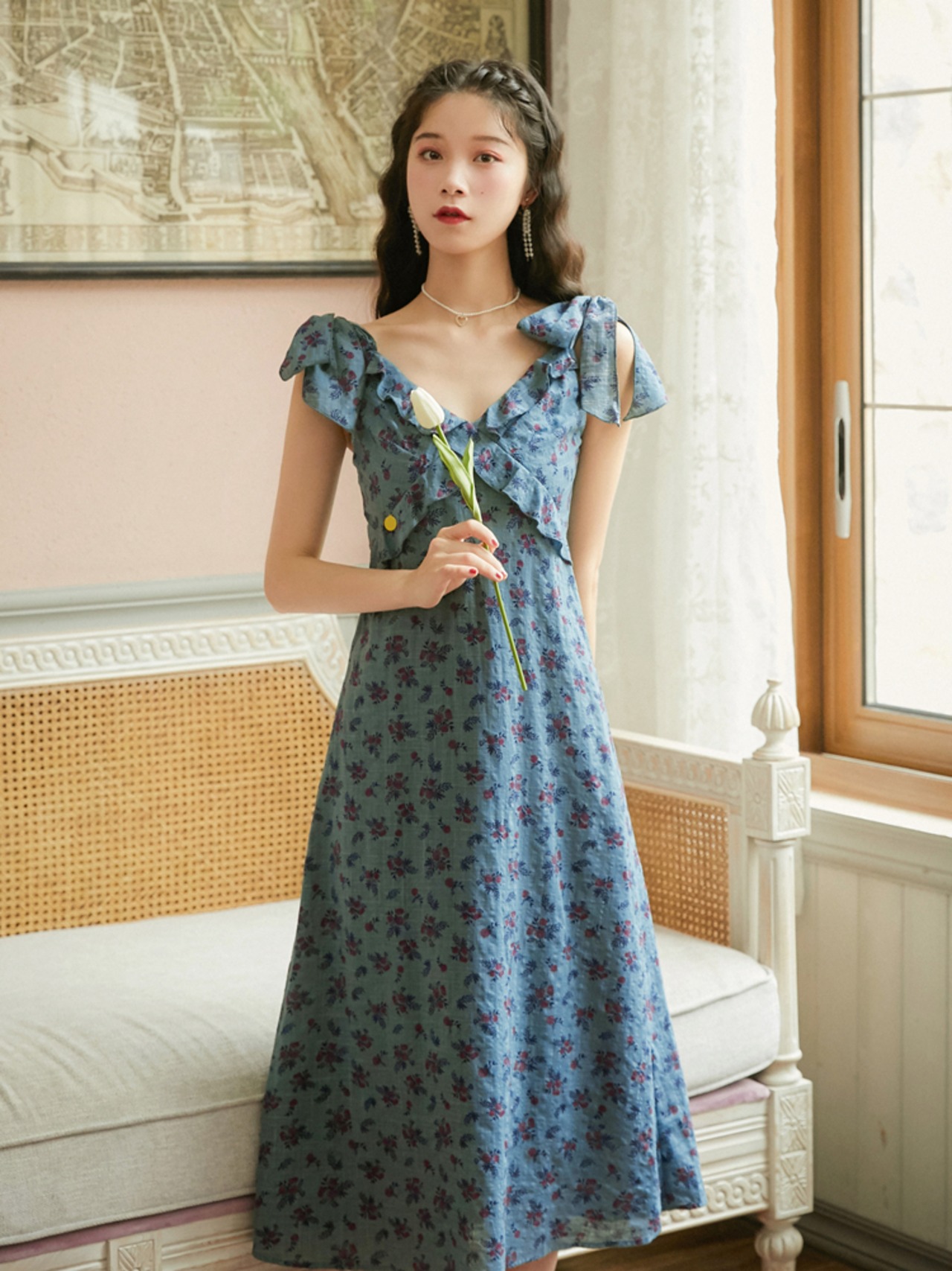 ♥♡♥ スタンダード花柄スカート ブルーVネック レトロ ♥♡♥韓国系 ガーリー お呼ばれ カジュアル フェミニン エレガント ビジュー 清楚 オルチャン AA9398930 | miel style clothing