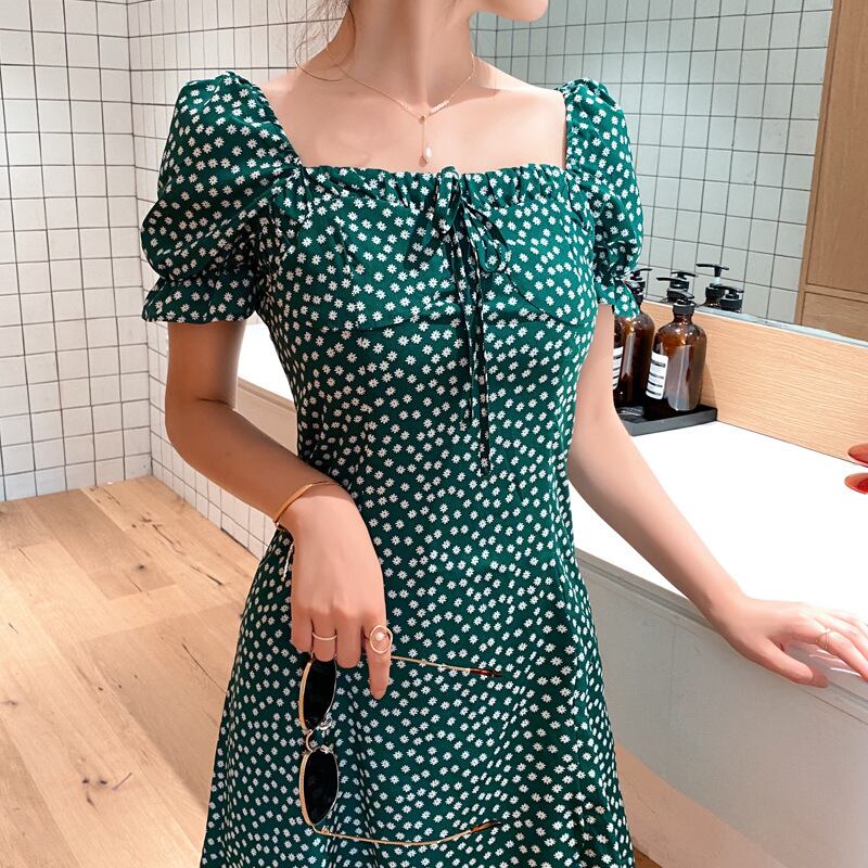 ♥♡♥ グリーン花柄ワンピースドレスOP スカート スリーブスリム スクウェア ♥♡♥韓国系 ガーリー お呼ばれ カジュアル フェミニン エレガ ント ビジュー 清楚 オルチャン CC3395393 | miel style clothing