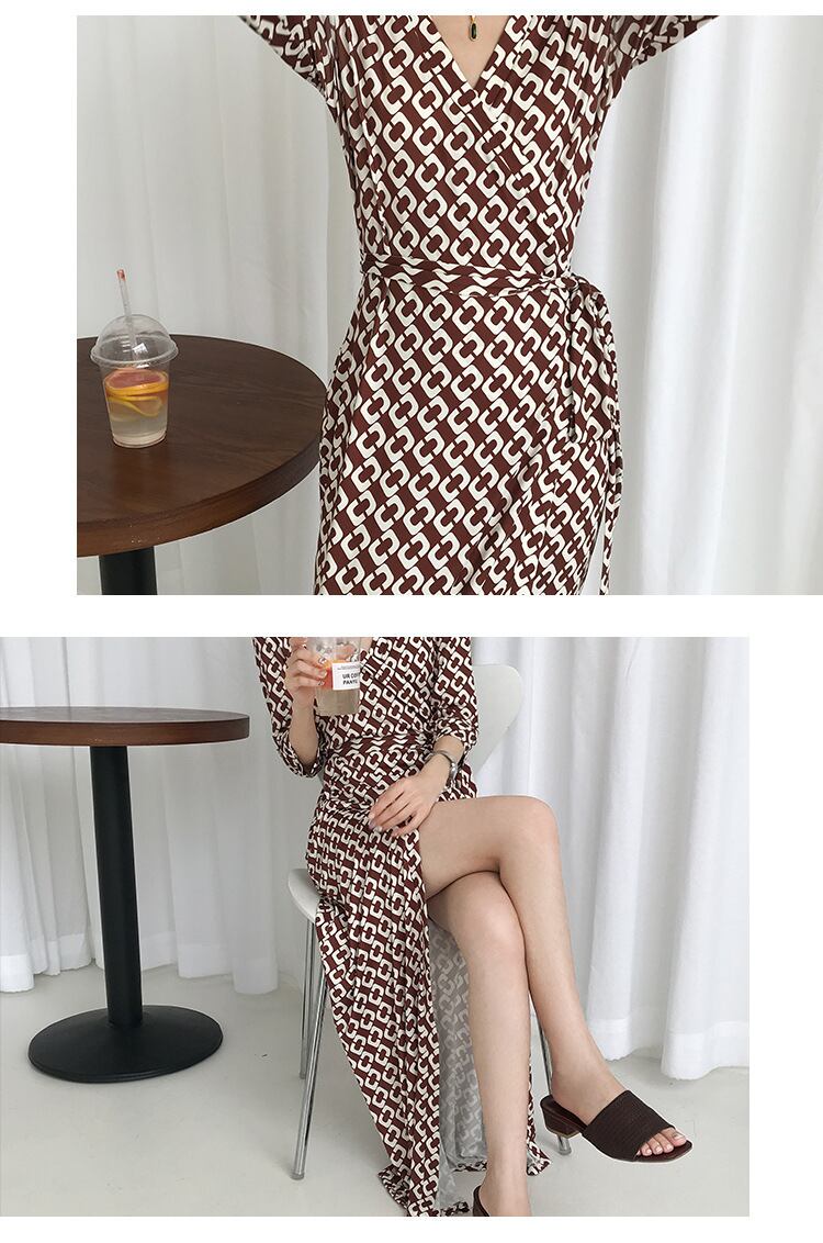 ♥♡♥ ワンピースレースチェーン プリントロングVネック七部袖スリーブスカート ♥♡♥韓国系 ガーリー お呼ばれ カジュアル フェミニン エレガ ント ビジュー 清楚 オルチャン CC5564509 | miel style clothing
