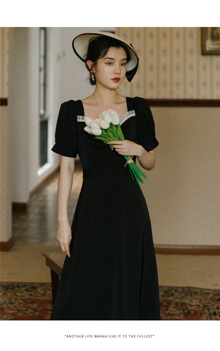 ♥♡♥ ♡ブラックスカート スタンダードスリーブ レトロ スクウェア ♥♡♥韓国系 ガーリー お呼ばれ カジュアル フェミニン エレガント ビジュー 清楚 オルチャン AA2608030 | miel style clothing