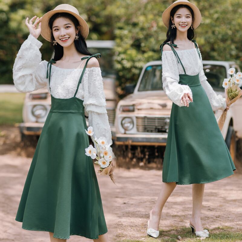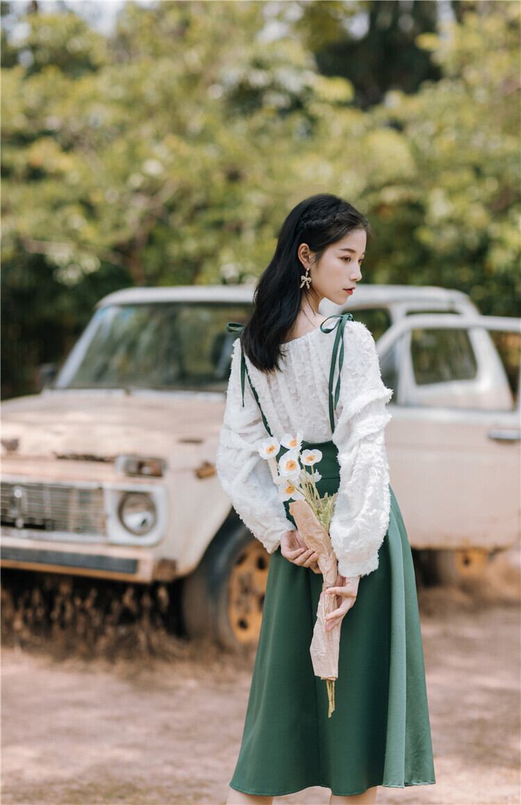 ♥♡♥ オータムスタンダードグリーンスカート シャツブラウス レトロ 秋物 ♥♡♥韓国系 ガーリー お呼ばれ カジュアル フェミニン エレガント ビジュー 清楚 オルチャン AA8929727 | miel style clothing