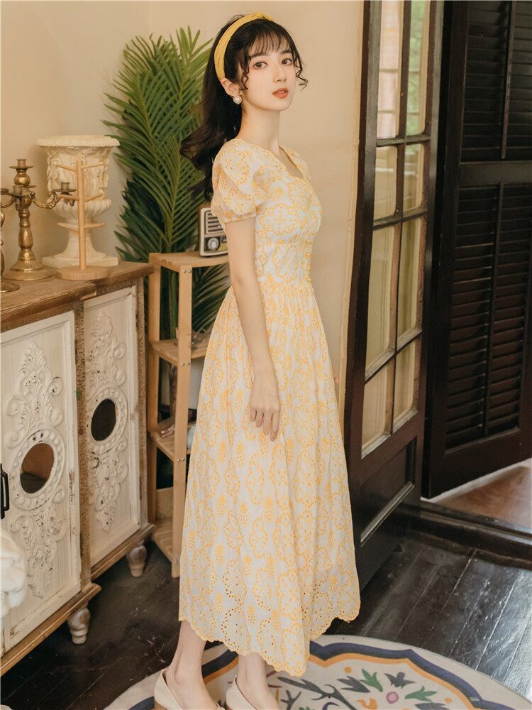 ♥♡♥ イエロースカート ♡スリーブ レッド レース 刺繍 スウィート ♥♡♥韓国系 ガーリー お呼ばれ カジュアル フェミニン エレガント ビジュー 清楚 オルチャン AA6596422 | miel style clothing