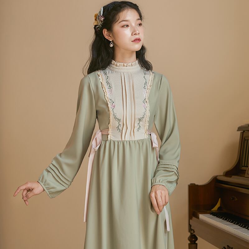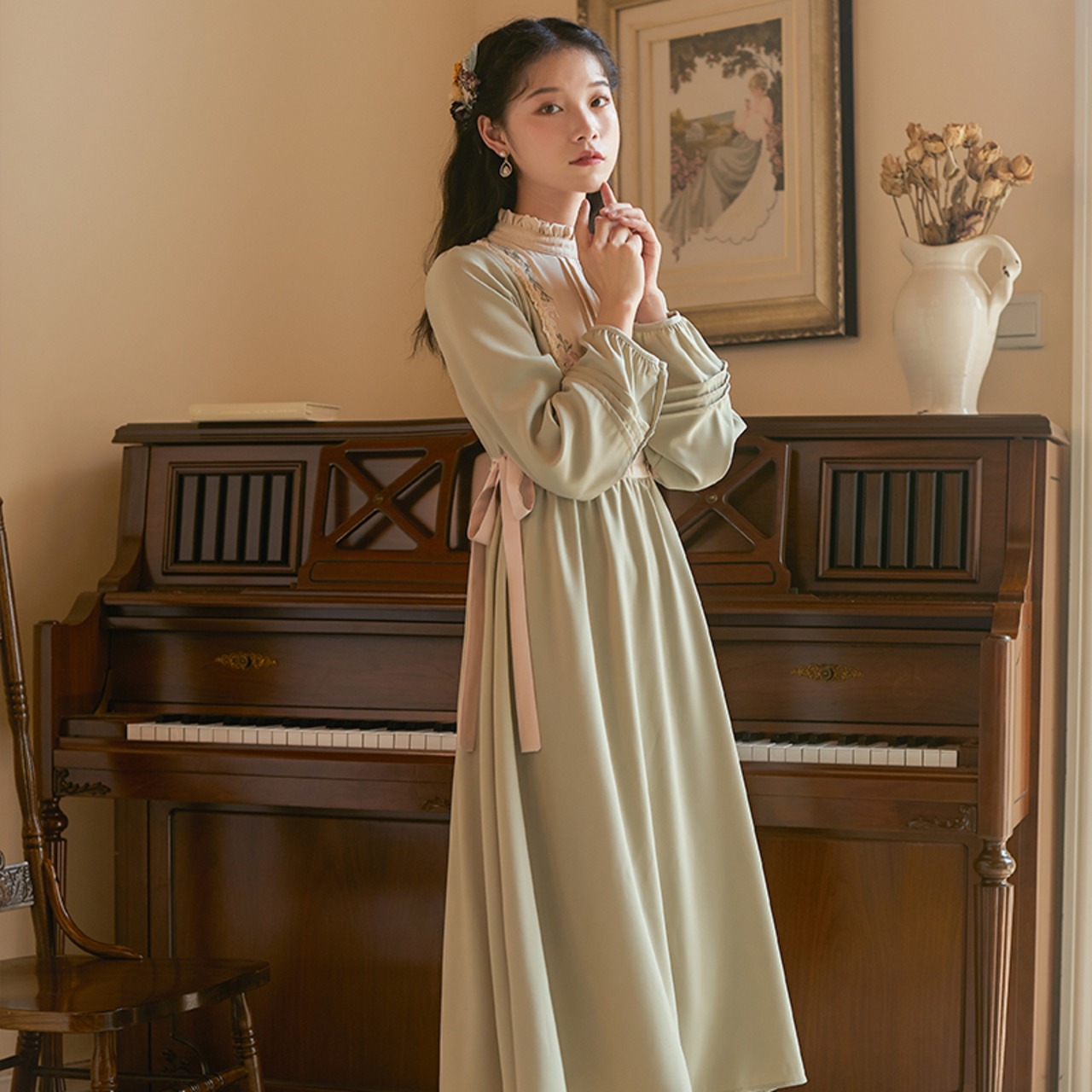 ♥♡♥ オータムスタンダード長袖スリーブスカート ドレス ワンピース★ ロング レトロ 秋物 ハーネス ベルト フラワーデザイン ♥♡♥韓国系 ガーリー お呼ばれ カジュアル フェミニン エレガント ビジュー 清楚 オルチャン AA9270171 | miel style clothing