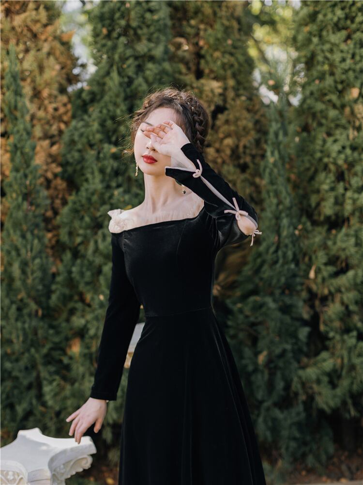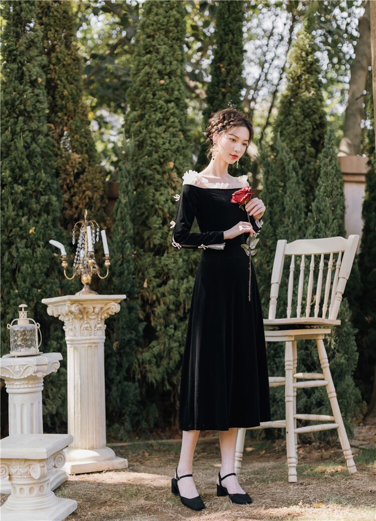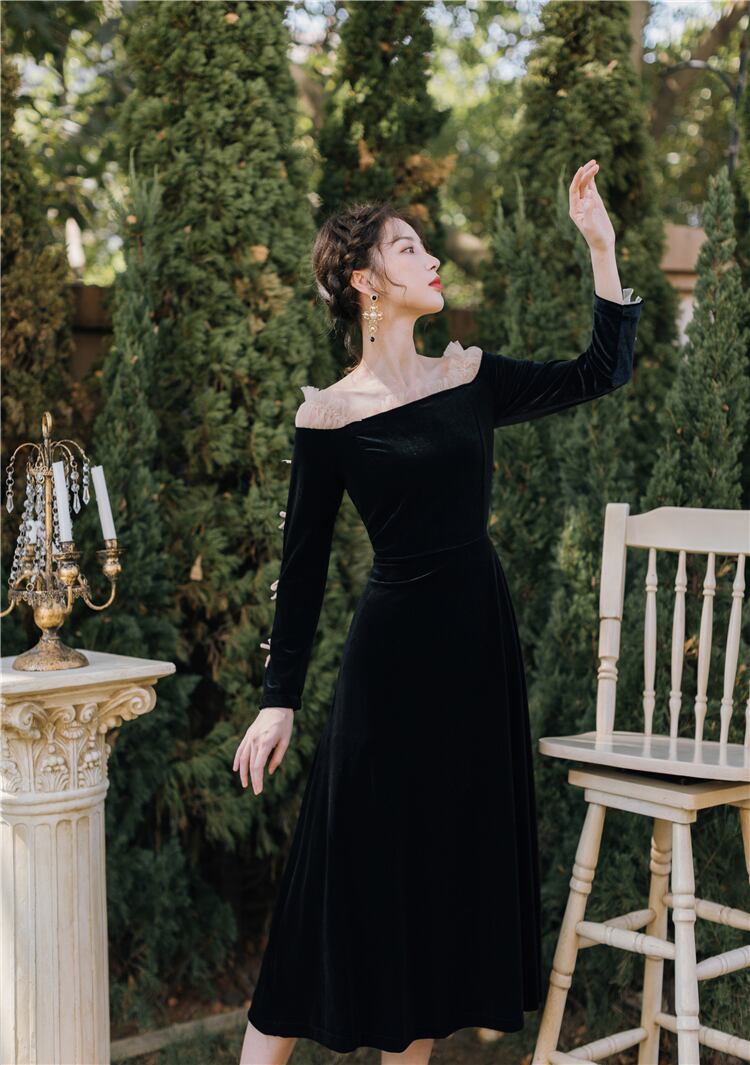 ♥♡♥ ♡スカート スタンダードブラックワンショルダーベルベット レトロ ♥♡♥韓国系 ガーリー お呼ばれ カジュアル フェミニン エレガント ビジュー 清楚 オルチャン AA0688333 | miel style clothing