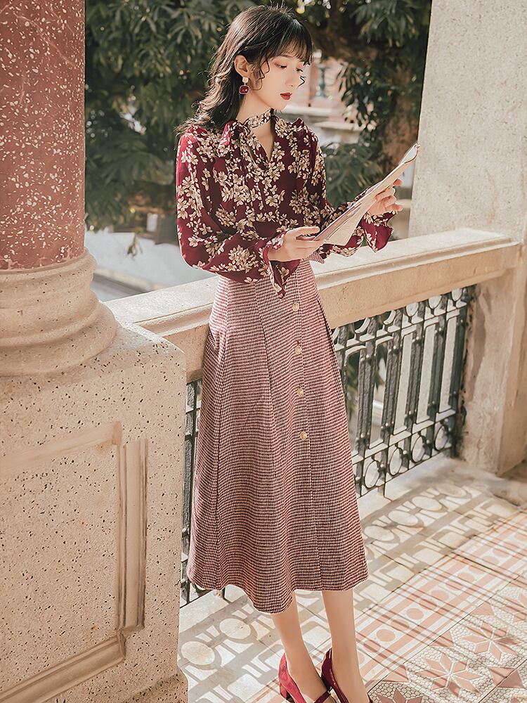 ♥♡♥ ♡シフォンシャツブラウスチェック柄スカート スタンダード レトロ ♥♡♥韓国系 ガーリー お呼ばれ カジュアル フェミニン エレガント ビジュー 清楚 オルチャン AA35668214028 | miel style clothing