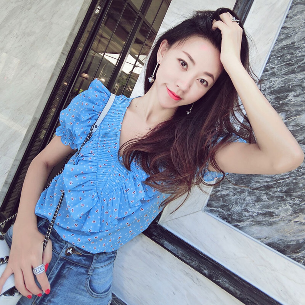♥新品 ブラウス Vネックブルー♥カワイイ♥スリーブシャツブラウス スウィート 韓国系 ガーリー お呼ばれ カジュアル フェミニン エレガント 同窓会 女子会 海 食事会 合コン パーティー BB0690988 | miel style clothing