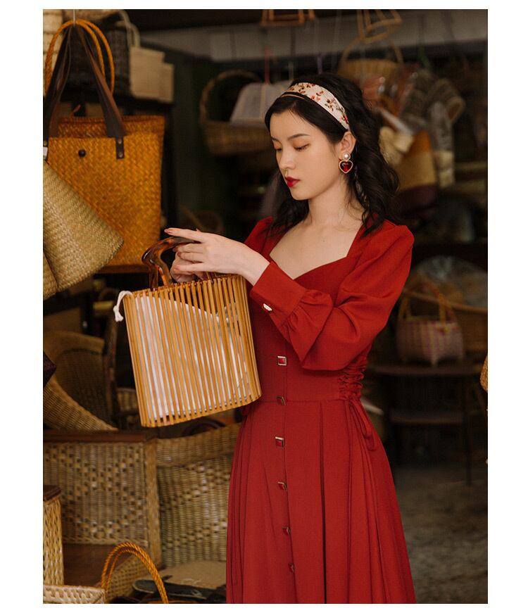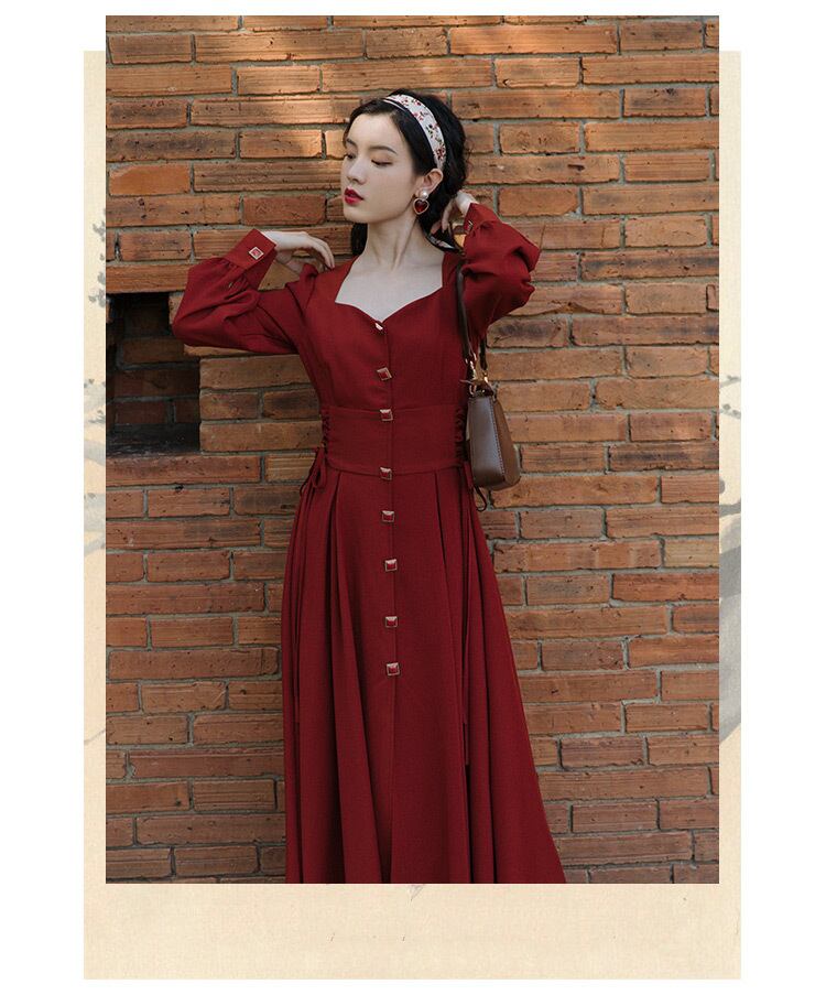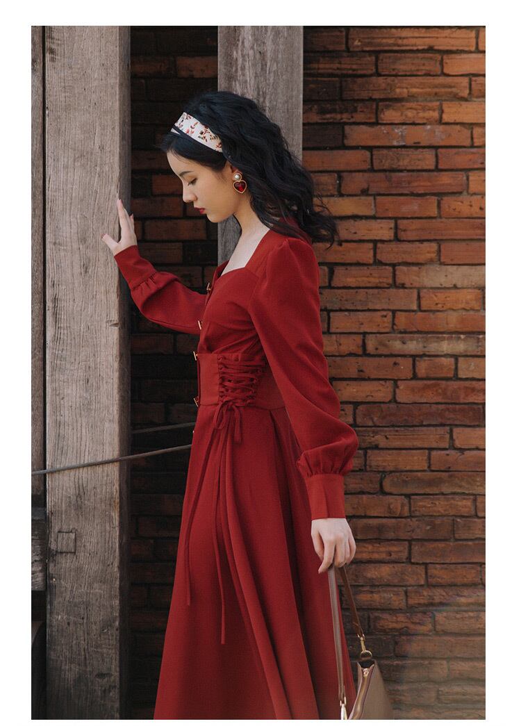 ♥♡♥ スタンダードレッドスカート ★♥カワイイ♥ロング レトロ 長袖 スクウェア ♥♡♥韓国系 ガーリー お呼ばれ カジュアル フェミニン エレガント ビジュー 清楚 オルチャン AA9207775 | miel style clothing