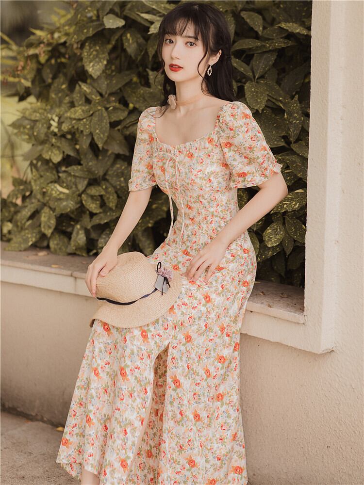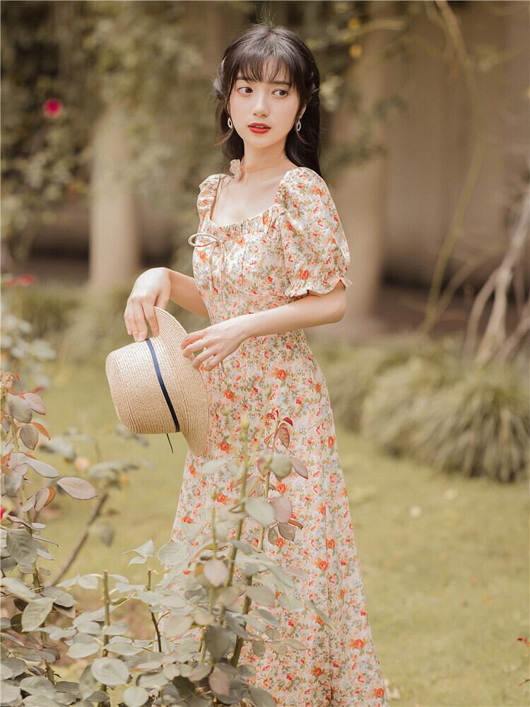 ♥♡♥ 花柄スカート ロングマキシドレス ワンピース スウィート スクウェア ♥♡♥韓国系 ガーリー お呼ばれ カジュアル フェミニン エレガント ビジュー 清楚 オルチャン AA7736765 | miel style clothing