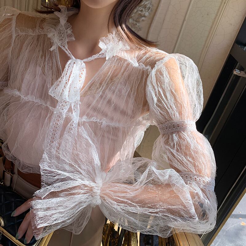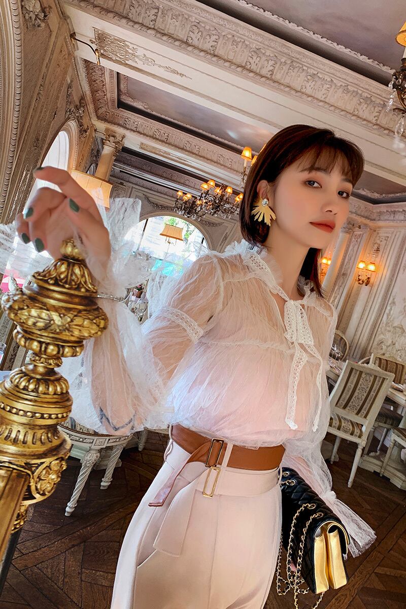 ♥新品 ♡白メッシュガウントップス シャツブラウス ロング ホワイト 韓国系 ガーリー お呼ばれ カジュアル フェミニン エレガント 同窓会 女子会 海 食事会 合コン パーティー BB0576474