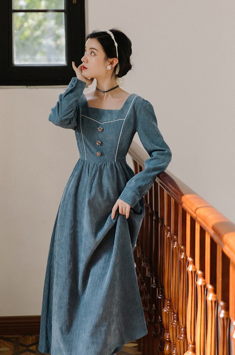 ♥ブルーコーデュロイレトロワンピースドレスOP スカート ウィンター♥秋冬 フラワーデザイン スクウェア ♥♡♥韓国系 ガーリー お呼ばれ カジュアル フェミニン エレガント ビジュー 清楚 オルチャン AA21930989067 | miel style clothing
