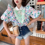 ♥新品 スリーブパールバックル花柄トップス 真珠 韓国系 ガーリー お呼ばれ カジュアル フェミニン エレガント 同窓会 女子会 海 食事会 合コン パーティー BB9302203 | miel style clothing