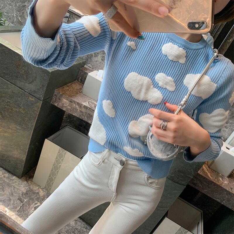 ♥クラウド柄セーター マシュマロ雲 コットン シャツブラウス ロング 韓国系 ガーリー お呼ばれ カジュアル フェミニン エレガント 同窓会 女子会 海 食事会 合コン パーティー BB74419631043 | miel style clothing