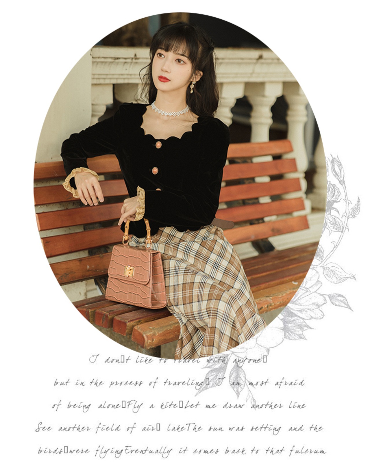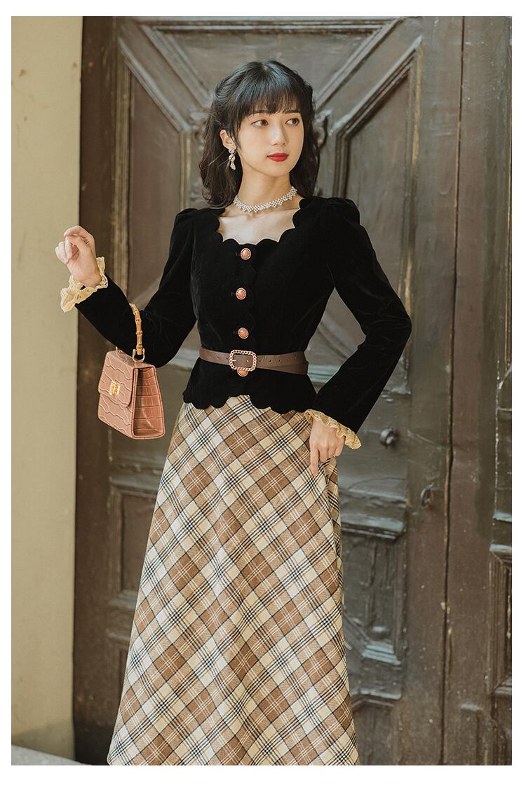 色:ブラックベルベットトップ,チェック柄スカート,ブラックベルベットトップ+チェック柄スカート+ベルト