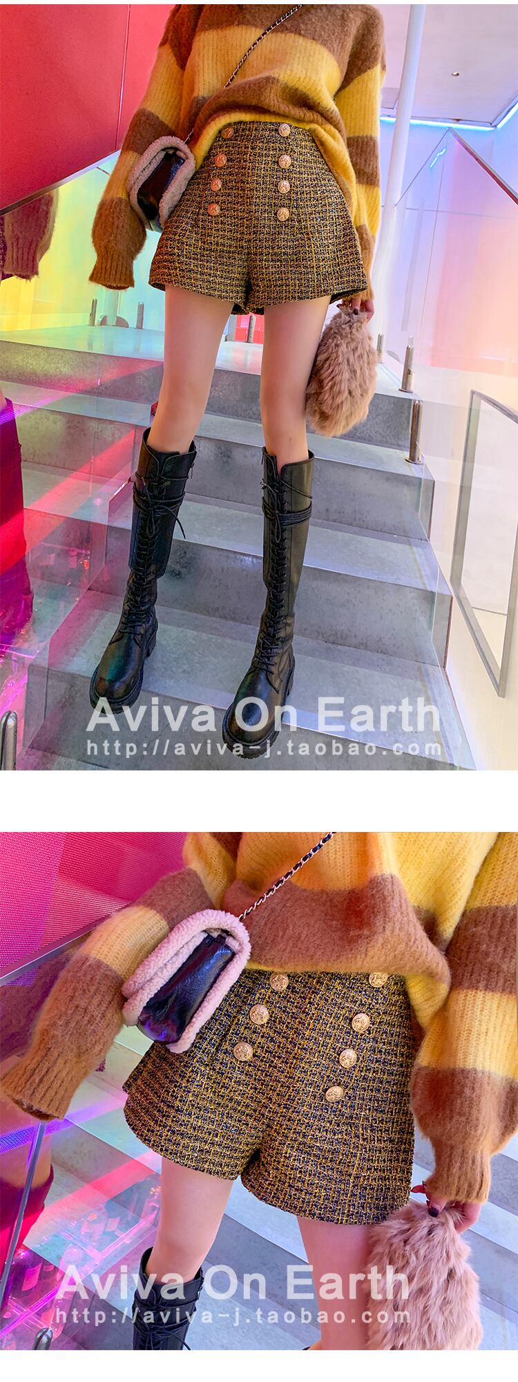 ♥新品ゴールド x ブラックチェックショートパンツ ウィンター 秋冬 韓国系 ガーリー お呼ばれ カジュアル フェミニン エレガント 同窓会 女子会 海 食事会 合コン パーティー BB14057116918 | miel style clothing