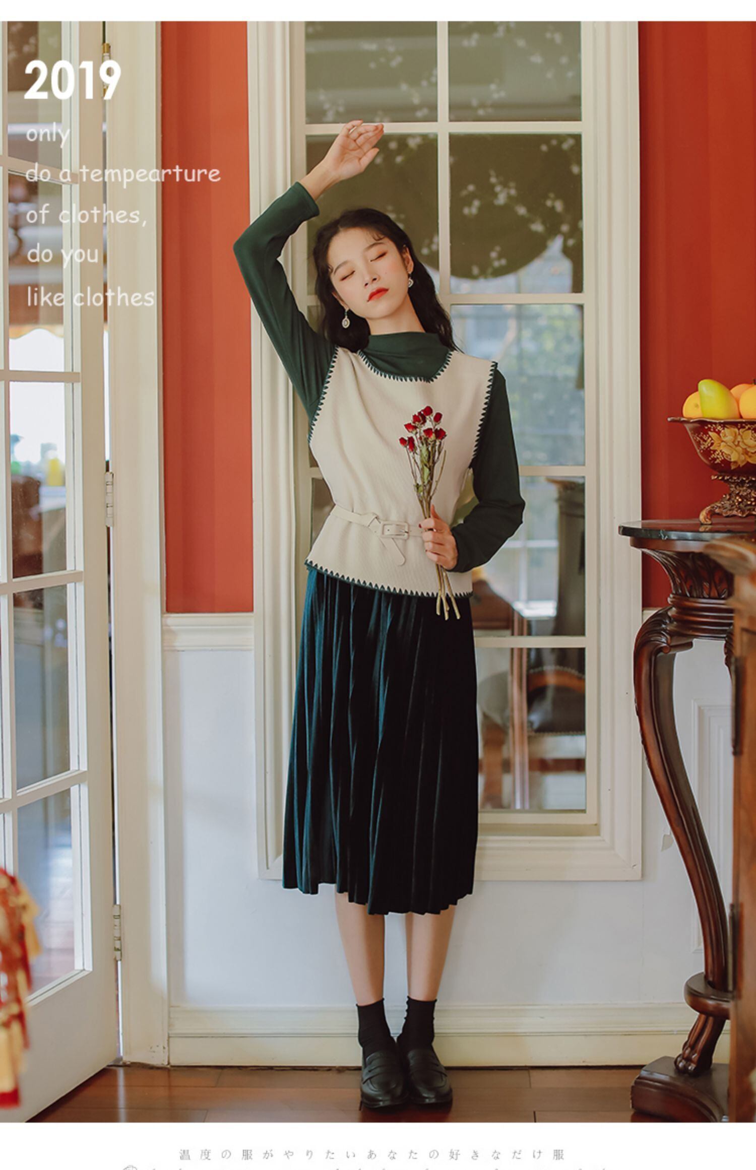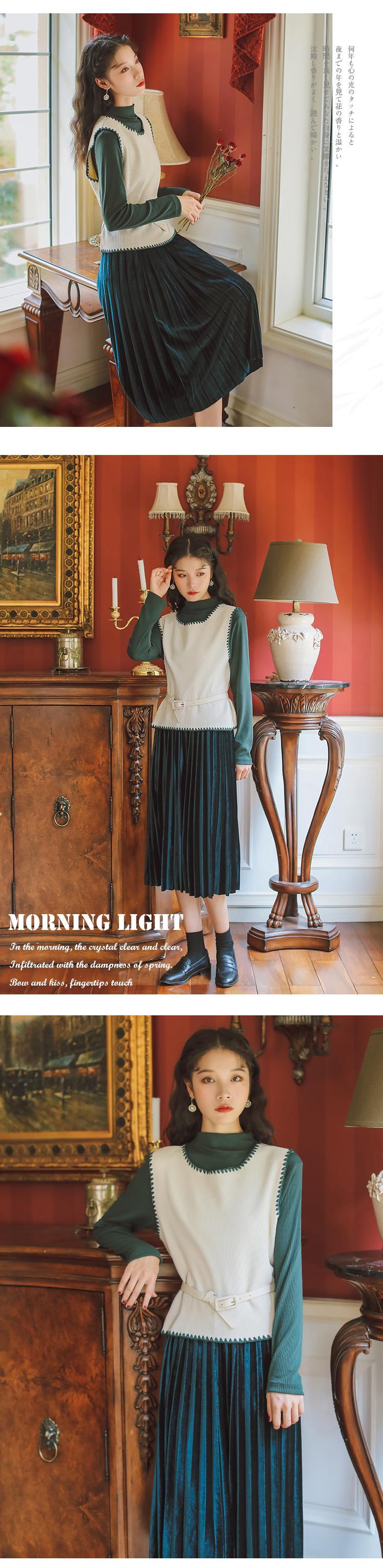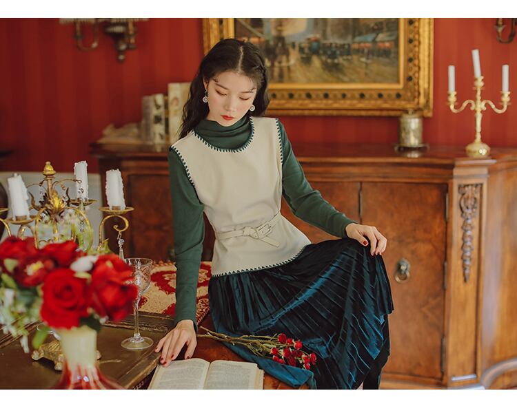 色:ダークグリーンマリスーツスカート,アプリコットベストスーツスカート