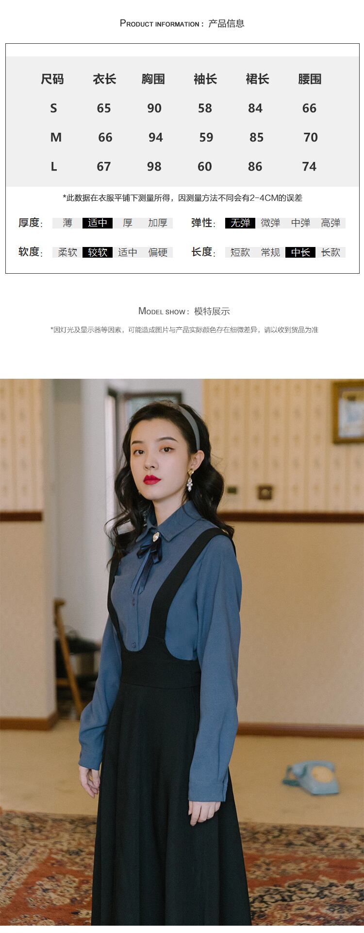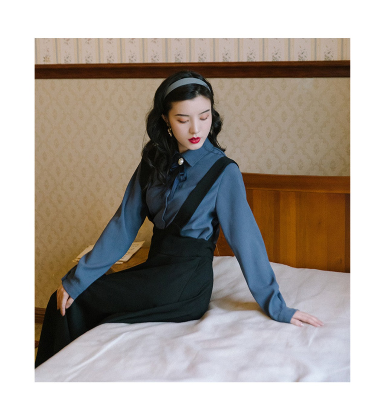 色:青いシャツ+黒ストラップスカート