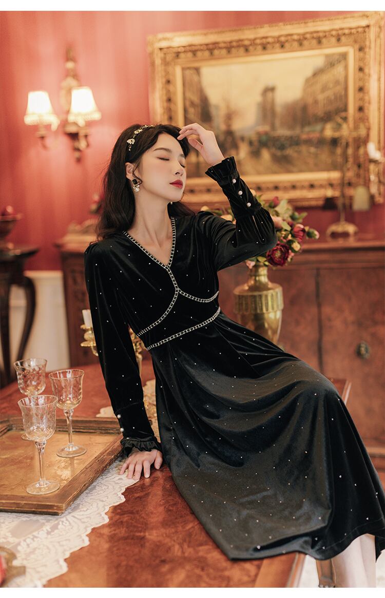 ♥ ゴールドベルベットブラックVネックドレス スタイルオータムウィンター 秋物 冬物 スカート ♥韓国系 欧州 ヨーロッパ インテリア ハイブランド ビジュー 宝石 ダイヤモンド ラインストーン ガーリー お呼ばれ カジュアル フェミニン エレガント 同窓会 女子会 海 食事会 合コン パーティー ド派手 メイク BTS TWICE NiziU BLACKPINK AA61725494188 | miel style clothing