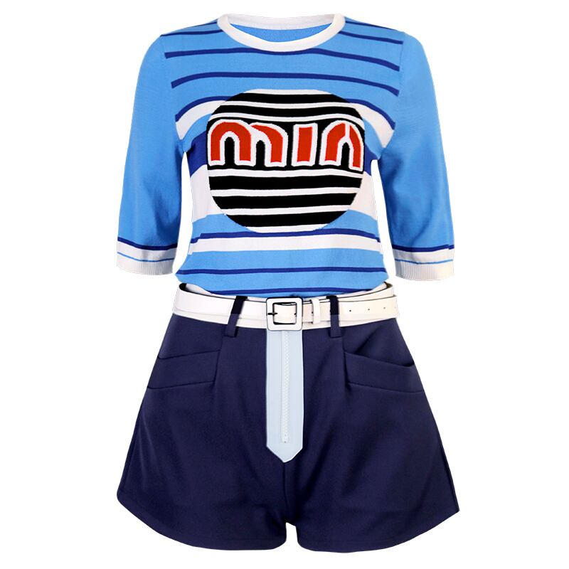 色:ニットトップスポット,ブルーショーツ+ホワイトベルト入荷