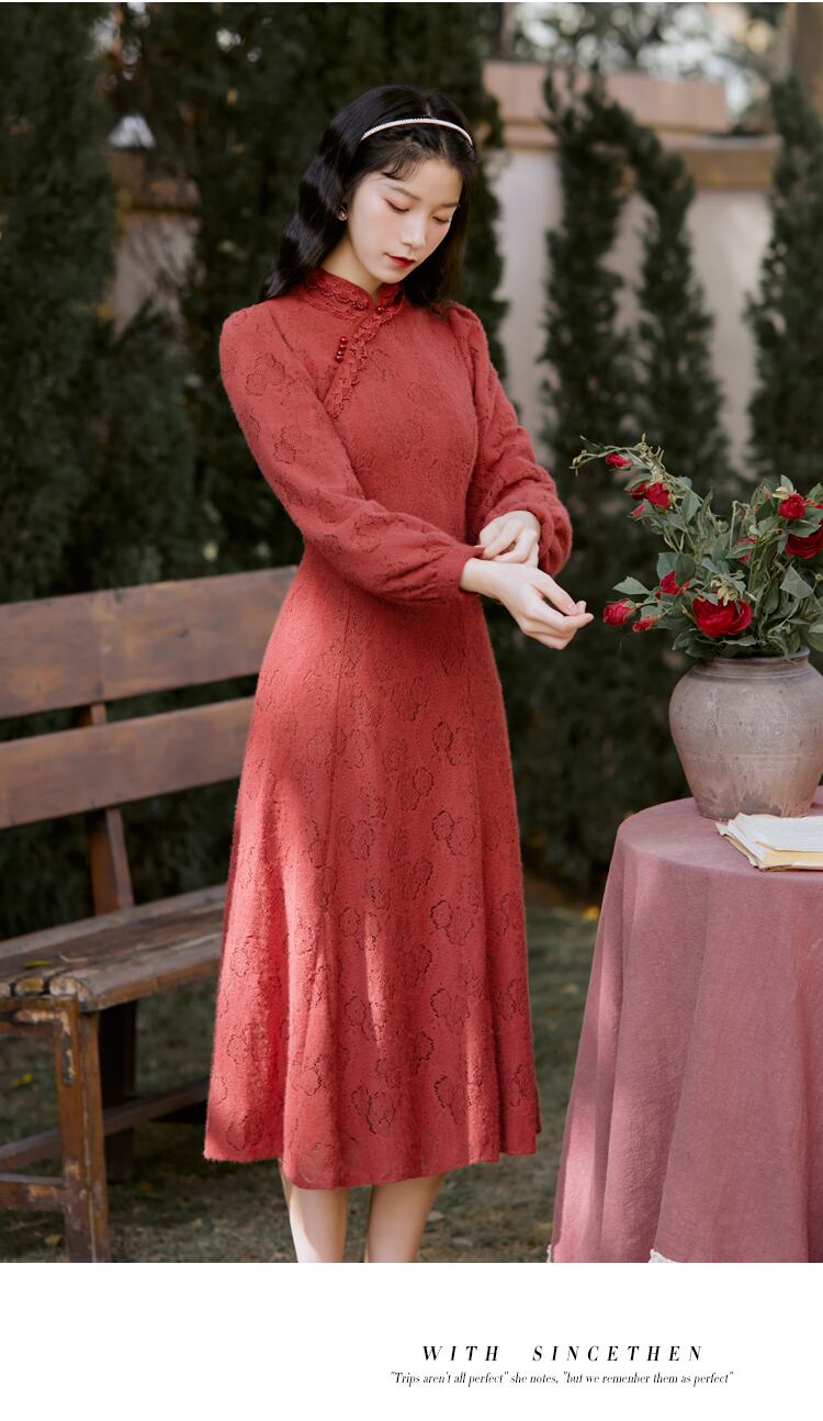 色:さびた赤いチャイナドレス,アプリコットチャイナ,さびた赤い四角いネックドレス,ベージュのスクエアカラードレス