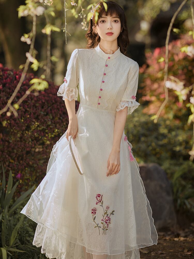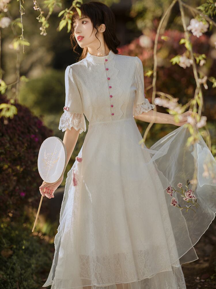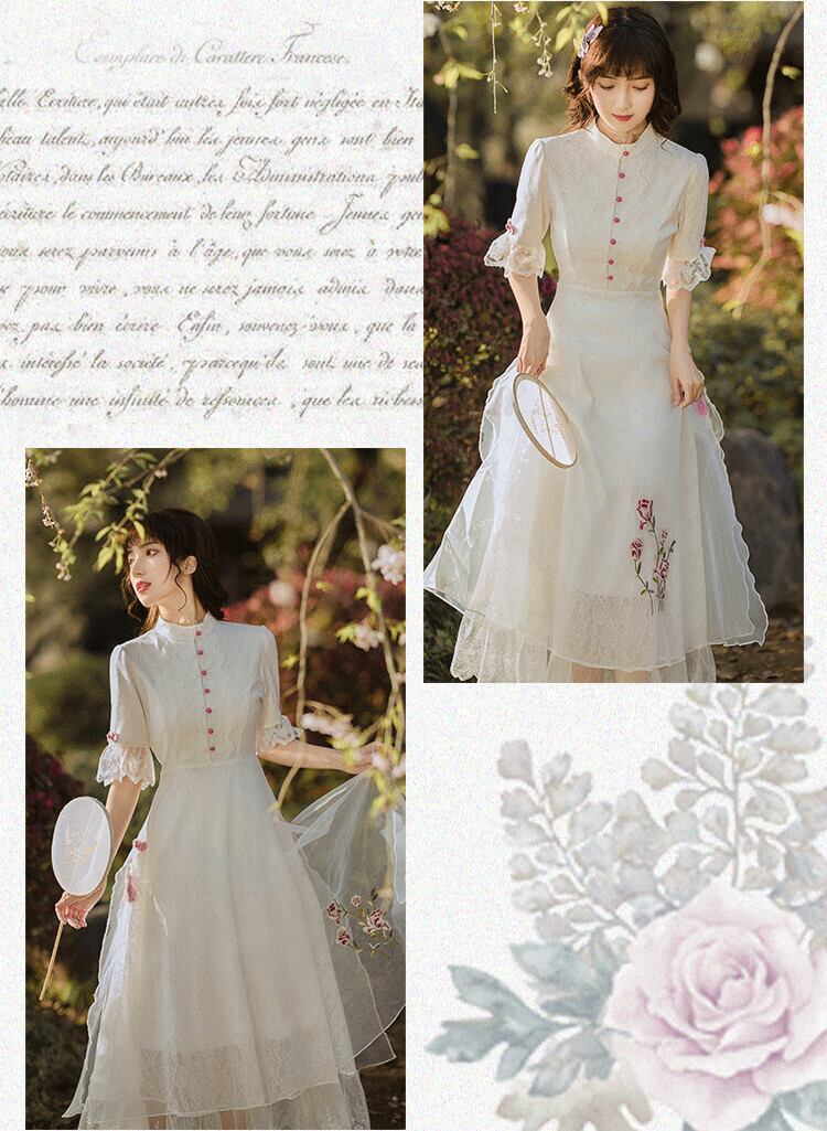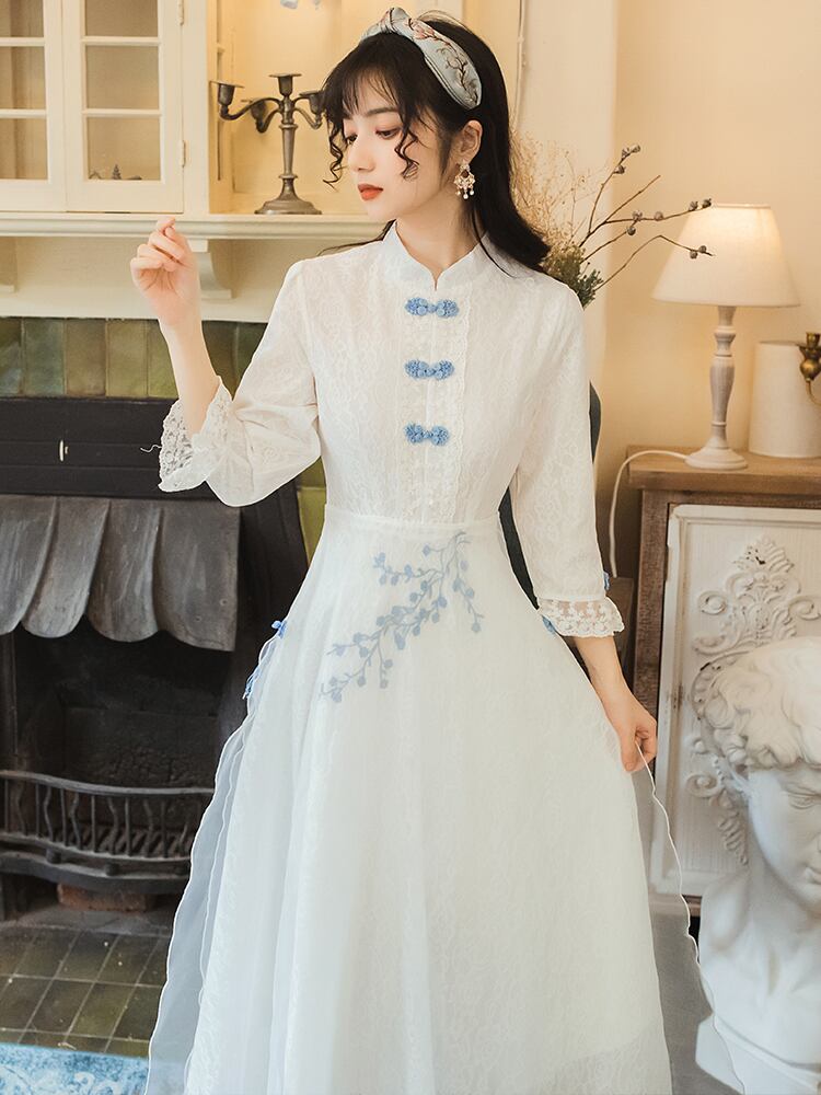 色:白、青のディスクバックルチャイナドレス,白、ピンクのディスクバックルチャイナドレス