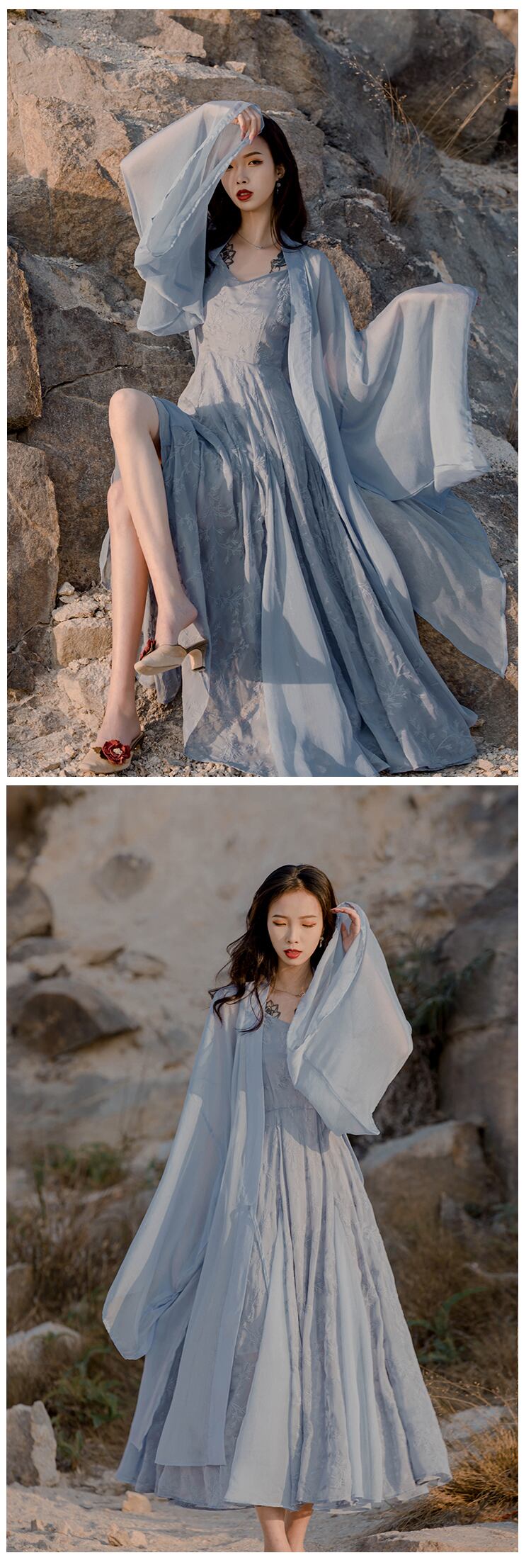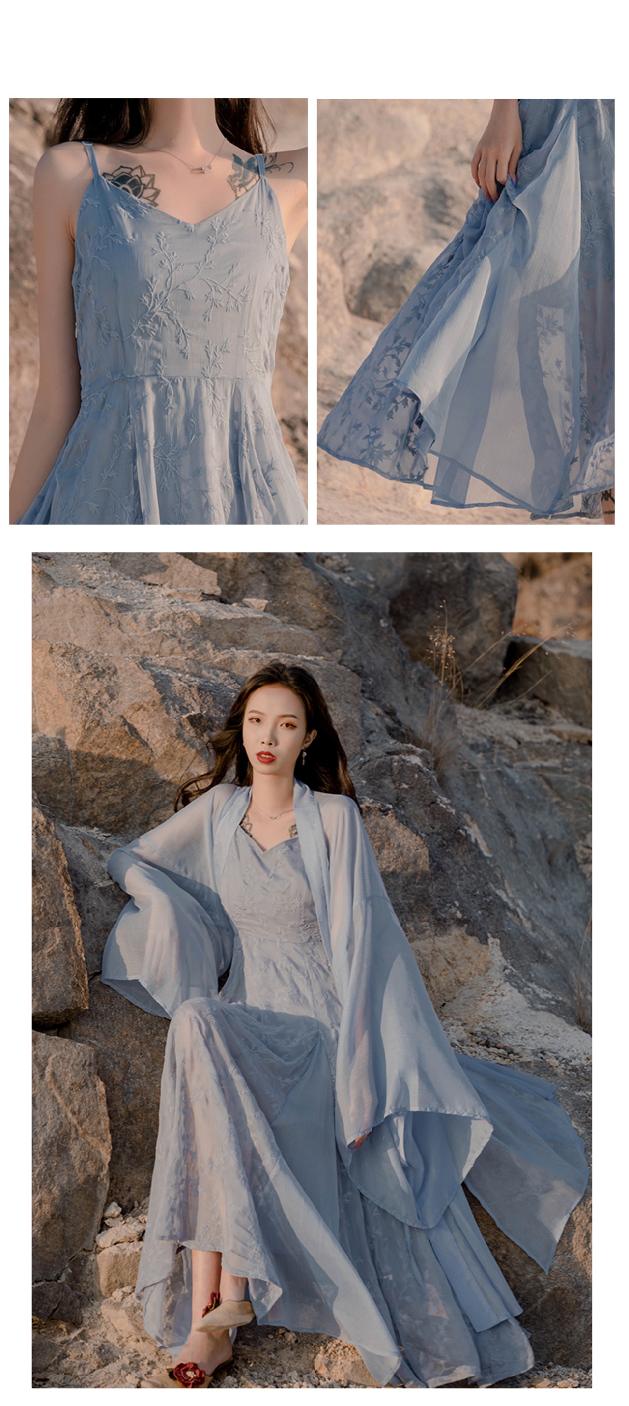 色:フォグブルーの刺繍サスペンダースカート,ブルーアウターシャツ